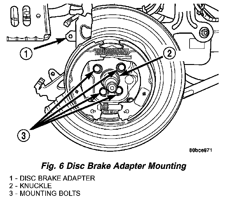 10. If the vehicle is equipped with rear disc brakes, remove the four bolts mounting the disc brake adapter to the rear knuckle (Fig. 6). Next, remove the adapter, rotor shield, parking brake shoes and parking brake cable as an assembly from the knuckle, then hang it out of the way using a wire hanger or cord.