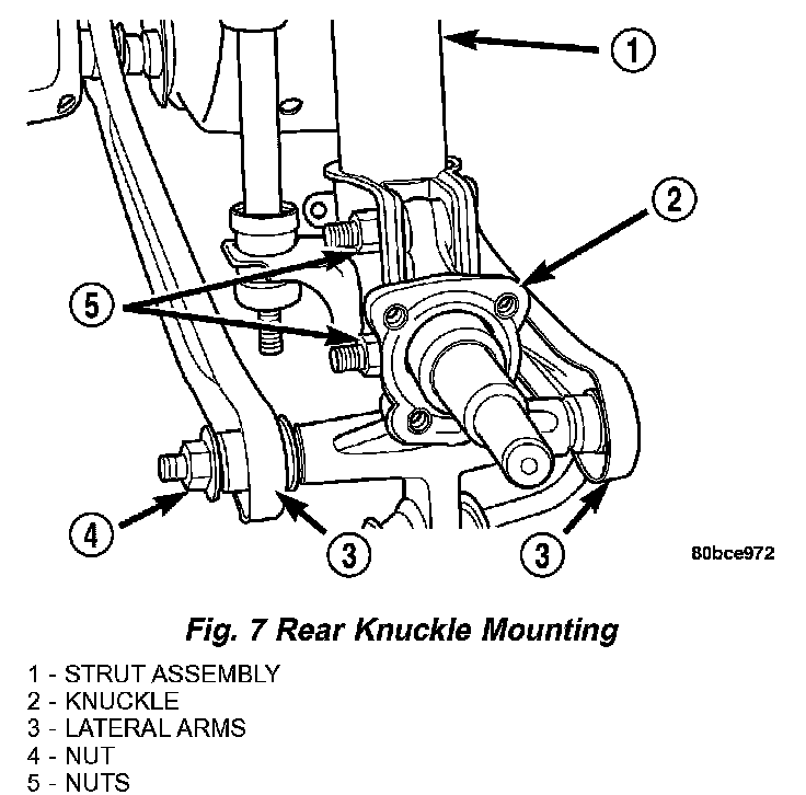12. Remove the nuts and bolt attaching the rear knuckle to the lateral arms (Fig. 7).