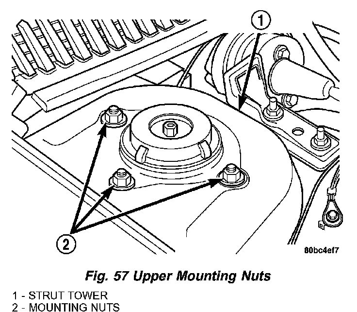 1. Install the strut assembly into the strut tower, aligning the three studs on the strut upper mount with the holes in strut tower. Install the three mounting nuts on the studs (Fig. 57). Tighten the three nuts to a torque of 34 Nm (300 inch lbs.).