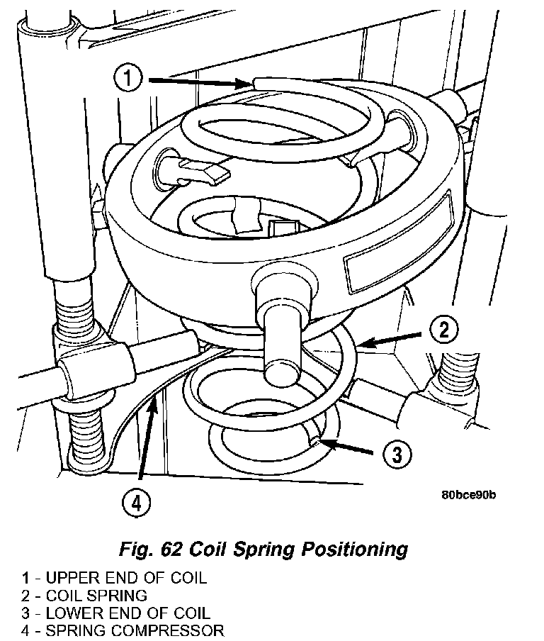 1. Place the coil spring in the compressor following the manufacturers instructions. Before compressing the spring, rotate the spring so the end of the top coil is directly in the back as shown (Fig. 62).