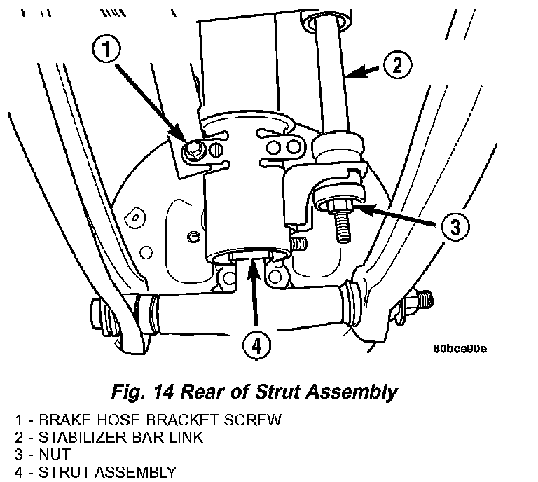 3. If the vehicle is equipped with rear drum brakes, remove the screw securing the brake hose bracket to the rear of the strut assembly (Fig. 14).