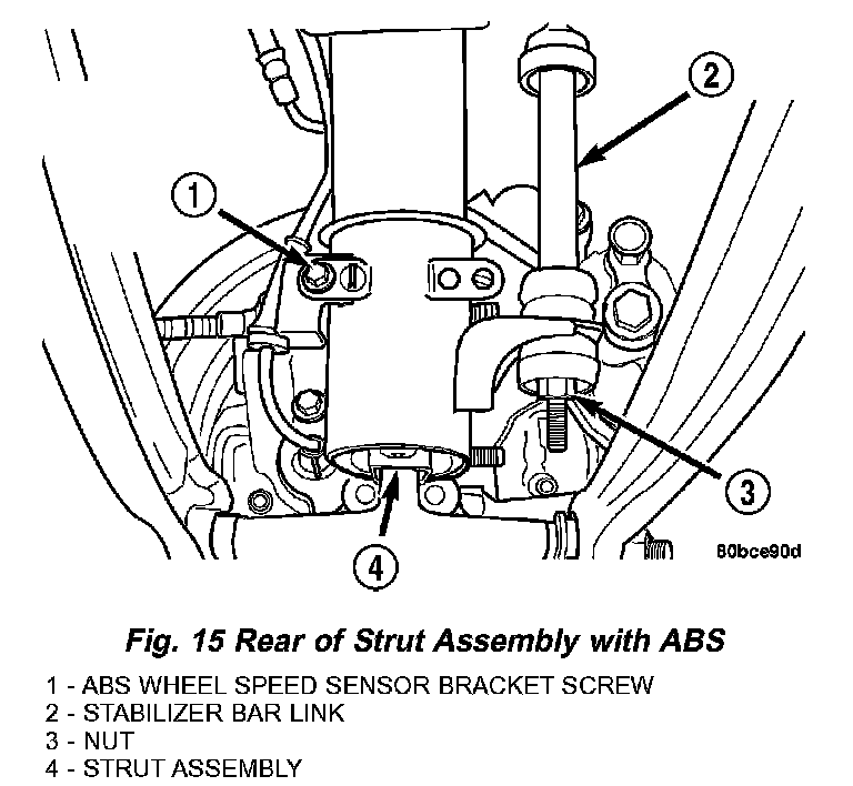 4. If the vehicle is equipped with the Antilock Brake System (ABS), remove the screw securing the ABS wheel speed sensor bracket to the rear of the strut assembly (Fig. 15).