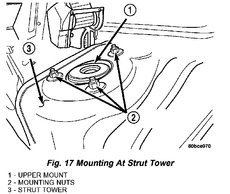 11. Loosen, but do not completely remove the 3 nuts securing the strut assembly to the strut tower (Fig. 17). Grasp the strut assembly to keep it from moving, then remove the 3 mounting nuts at the strut tower.
