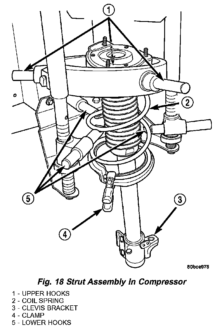 2. Position the strut assembly in the strut coil spring compressor following the manufacturers instructions. Set the lower, then upper hooks on the coil spring (Fig. 18). Position the strut clevis bracket straight inward toward the compressor. Place a clamp on the lower end of the coil spring, so the strut is held in place once the strut shaft nut is removed.