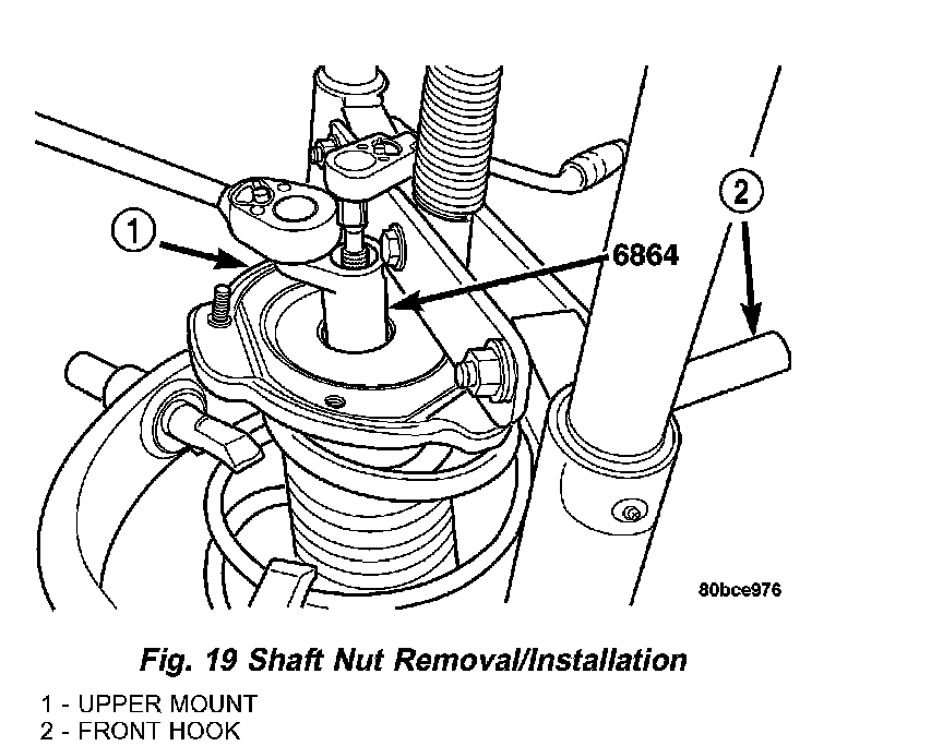 4. Once the spring is sufficiently compressed, install Strut Nut Socket, Special Tool 6864, on the strut shaft retaining nut (Fig. 19). Next, install a socket on the hex on the end of the strut shaft. While holding the strut shaft from turning, remove the nut from the strut shaft.