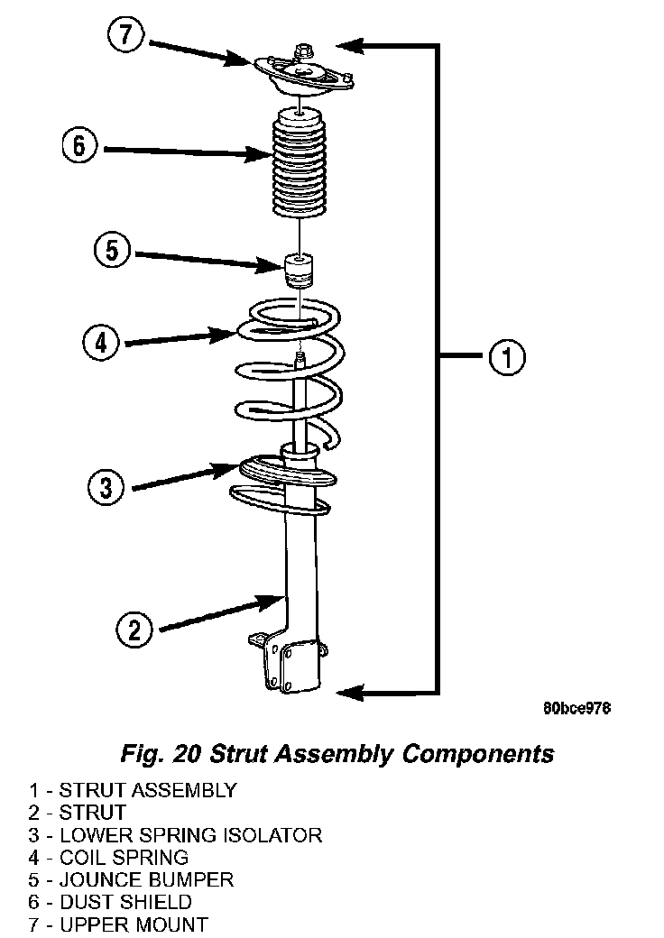 For the disassembly and assembly of the strut assembly, use strut spring compressor, Pentastar Service Equipment (PSE) tool W-7200, or the equivalent, to compress the coil spring. Follow the manufacturer's instructions closely.