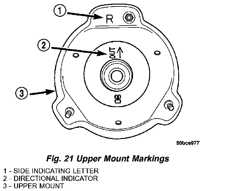 NOTE: Before installing the upper mount, check to make sure the correct side mount is being installed. Left and right upper mounts are different. A left mount will be marked with the letter "L" while a right mount will be marked with the letter "R" (Fig. 21).
