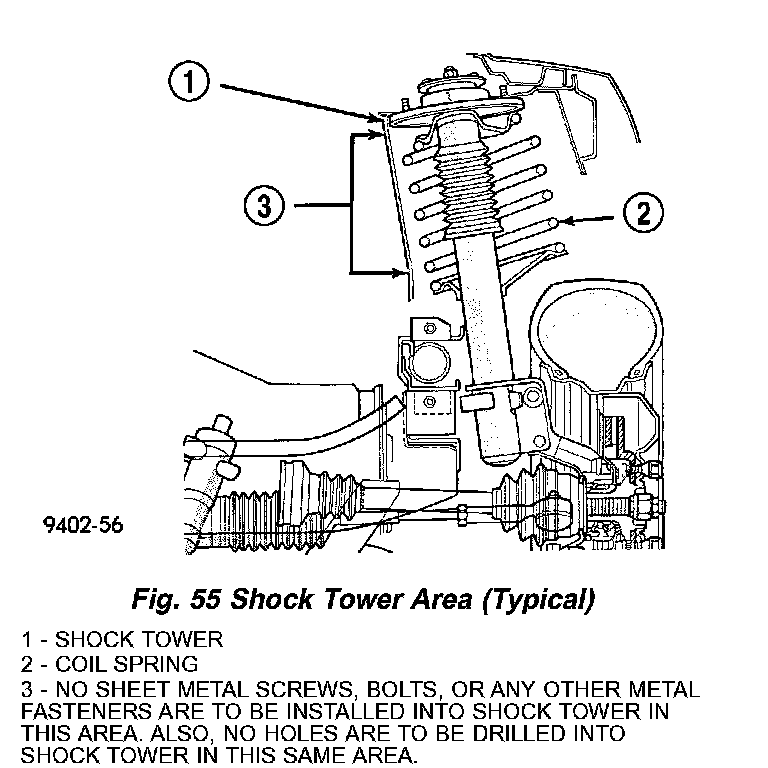 CAUTION: At no time when servicing a vehicle can a sheet metal screw, bolt or other metal fastener be installed into the shock tower to take the place of an original plastic clip. Also, do not drill holes into the front shock tower for the installation of any metal fasteners into the shock tower area indicated (Fig. 55).
