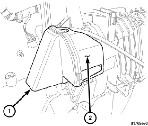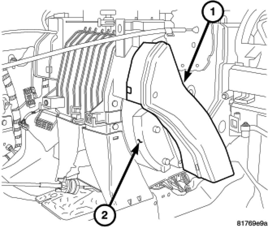 5. Remove the screw that secures the left floor distribution duct (1) to the left side of the HVAC housing (2) and disconnect the duct from the housing outlet.