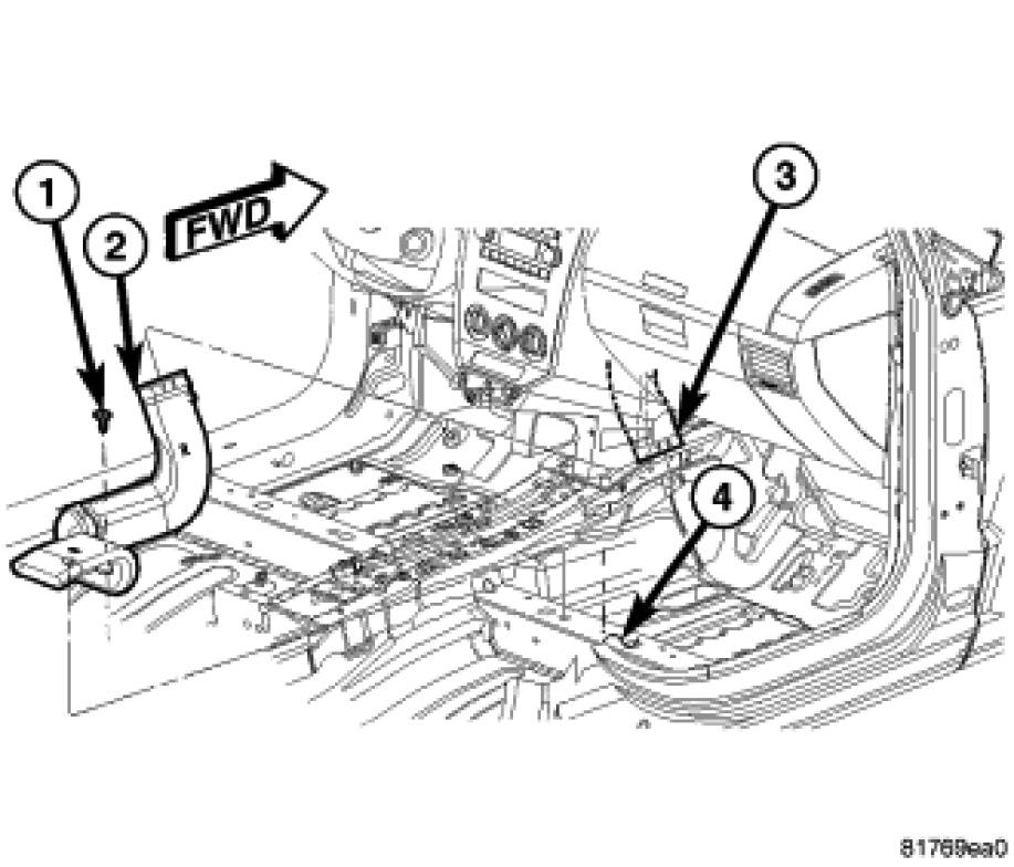 12. Remove the screw (1) and disengage the retainer that secures the rear seat floor duct to the floor support (4).