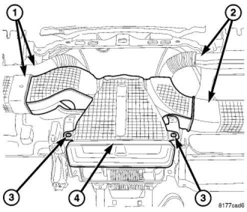 8. Remove the two screws (3) that secure the center instrument panel duct (4) to the instrument panel support.