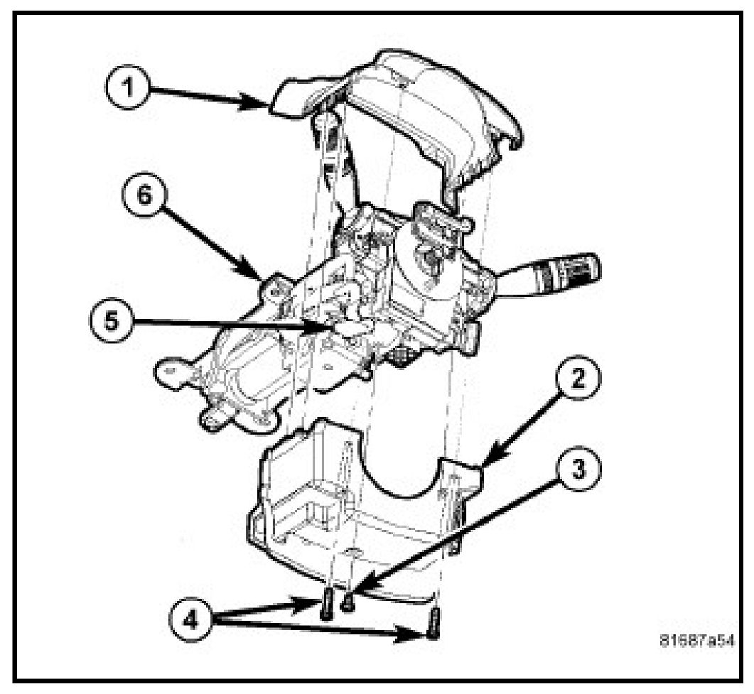 5. Install the screw (3) attaching the lower shroud (2) to the steering column (6).