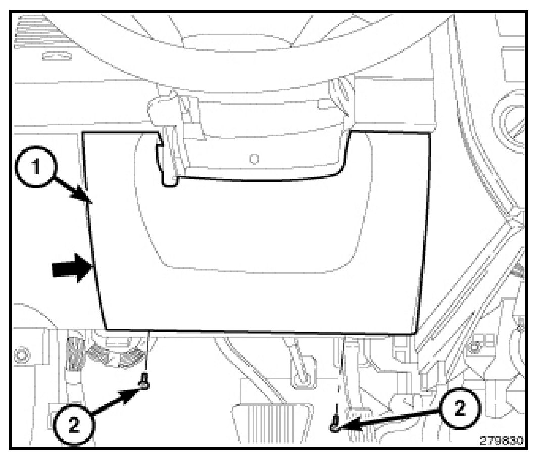 9. Place the steering column opening cover (1) in place and seat the clips fully.