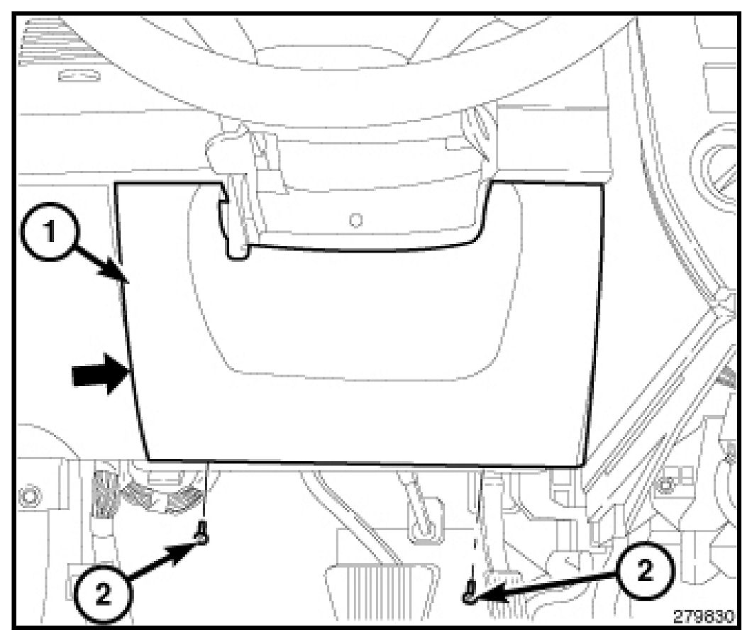 1. Remove the screws (2) from the bottom of the steering column opening cover (1).