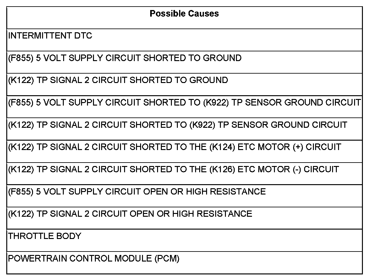 - Repair the (K122) TP Signal 2 circuit for a short to the (K126) ETC Motor (-) circuit.