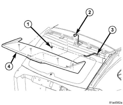 3. Remove the adhesive cover strips, install spoiler (4) to the lift gate and press down on the areas of the spoiler that have the adhesive patches installed.