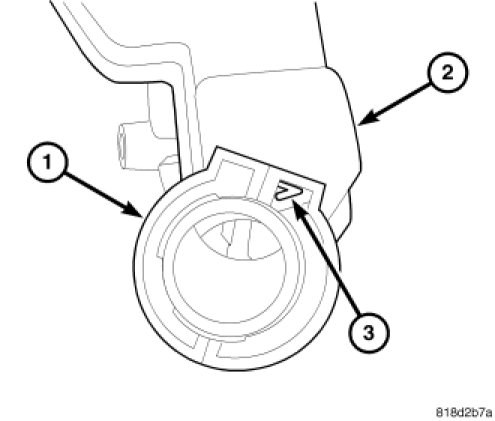 6. If equipped with a manual transaxle and a new reservoir is being installed, using an appropriate cutting tool, cut the clutch actuator port at the center of the "V" groove (2) opening the hydraulic clutch port (1). Discard the severed plug (3).