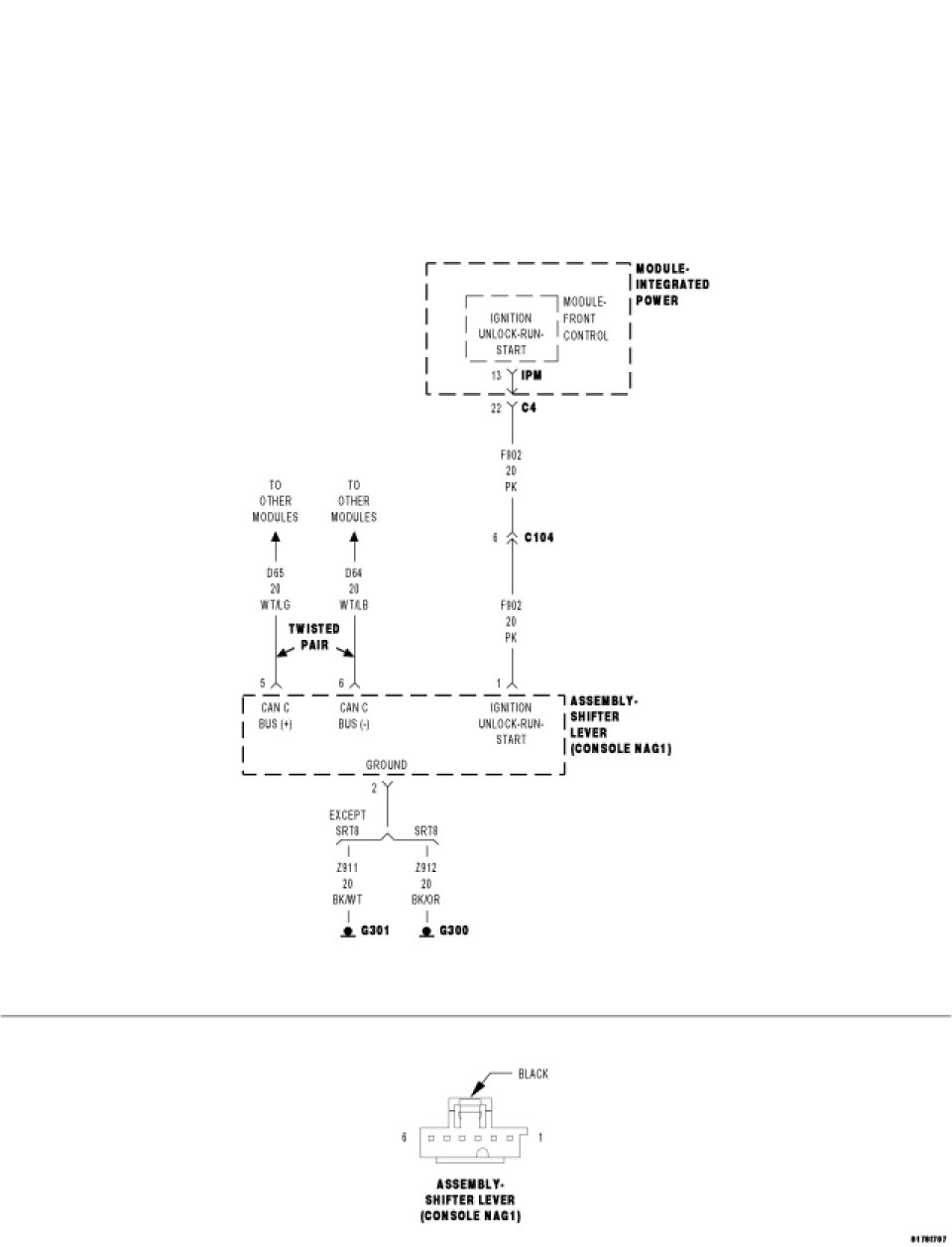 Measure the resistance of the (D64) CAN C Bus (-) circuit between the FCM connector and the Shifter Lever Assembly connector.