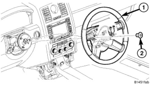 5. Remove the steering wheel retainer bolt (2), then slide the steering wheel (1) off the shaft.