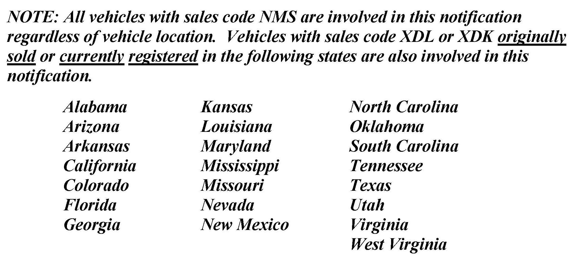 All vehicles with sales code NMS are involved in this notification regardless of vehicle location. Vehicles with sales code XDL or XDK originally sold or currently registered in the following states are also involved in this notification.