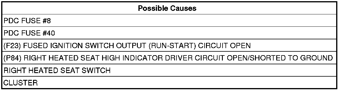 - Repair the (P84) Right Heated Seat High Indicator Driver circuit for a short to ground
