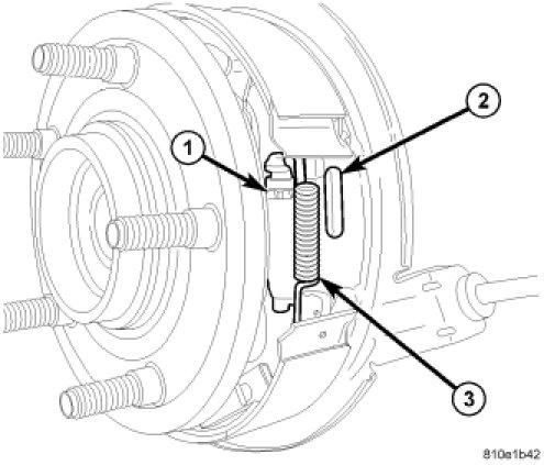 3. Install parking brake shoe adjuster (1) between upper and lower parking brake shoes. Position end of adjuster with star wheel upward. Once in place, slide upper shoe downward against adjuster mounting slot, taking up any slack between two pieces.