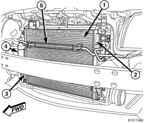 The automatic transmission cooler (2) is located in the front of the radiator and behind the front fascia and is combined with the A/C condenser. The transmission cooler is a heat exchanger that allows heat in the transmission fluid to be transferred to the air passing over the cooler fins.