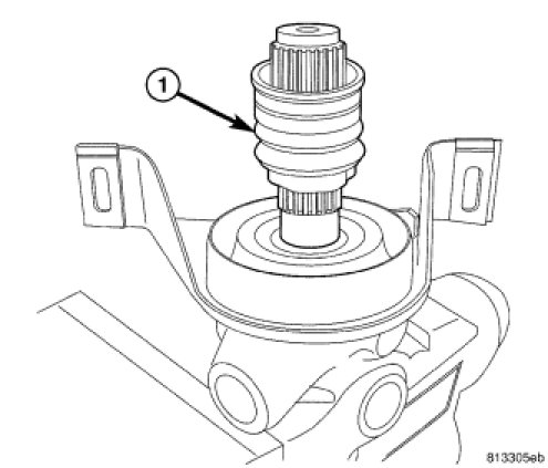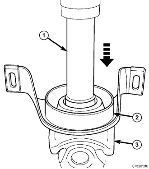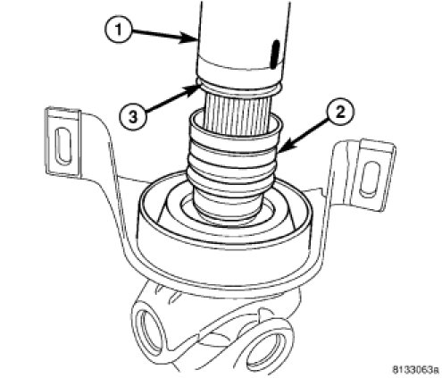 1. Install propeller shaft rear segment into press, supported on joint yoke (3).
