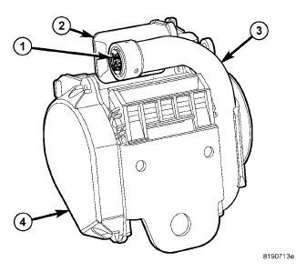 The seat belt tensioner consists primarily of a sprocket/pinion, a steel tube (3), a cast metal housing, numerous steel balls, a stamped metal ball trap (2), a torsion bar and a small pyrotechnically activated gas generator with a connector receptacle (1). All of these components are located on one side of the retractor spool on the outside of the retractor housing except for the torsion bar, which serves as the spindle upon which the retractor spool rides. The seat belt tensioners are controlled by the Occupant Restraint Controller (ORC) and are connected to the vehicle electrical system through a dedicated take out of the body wire harness by a keyed and latching yellow molded plastic connector insulator to ensure a secure connection.