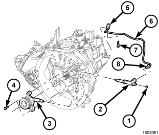 2. Disconnect the clutch hydraulic line (6) from the bleeder assembly (2).