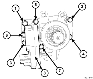 4. Remove the 3 bolts (5), (6), (7) from the front axle disconnect solenoid, and remove the front axle disconnect solenoid (8).