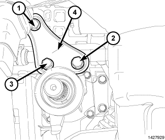 6. Remove four bolts (1) from the front axle disconnect (3) and remove it from from the engine