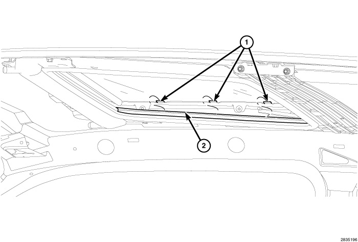 2. With the sunroof in the open position, snap the mechanism cover into the lower guide channel (2).