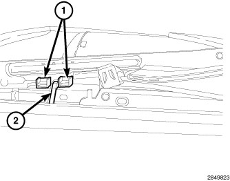 2. Align the opening between the glass guide bosses (1) with the guide carriage foot (2) and lower the glass guide to engage.