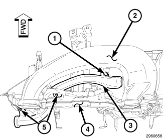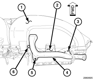 3. Remove the push-pin fastener (6) that secures the right side demister duct (4) to the instrument panel duct (1).