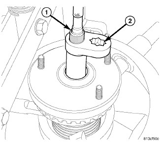 10. Install Wrench (on end of a torque wrench), Special Tool , on shock shaft retaining nut. Next, insert 8 mm socket though Wrench onto hex located on end of shock shaft. While holding shock shaft from turning, tighten nut using Wrench to 90 Nm (66 ft. lbs.) torque.