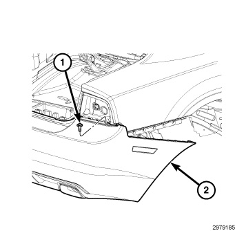 4. Install the fastener (1) located in the taillamp cavity that secures the fascia (2) to the rear quarter. Tighten the fastener securely. Repeat for opposite side.