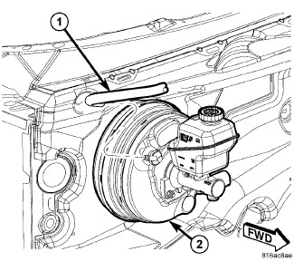 8. Connect vacuum hose (1) to check valve on face of booster (2). Do not remove check valve from booster.