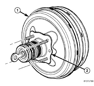 NOTE: Before installing booster, make sure there is a NEW booster seal (2) placed over push rod and mounting studs on rear of booster (1).