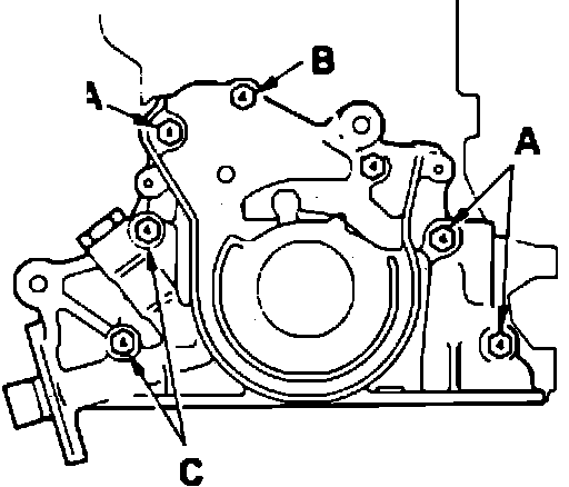 a. When installing timing case attaching bolts, refer to Fig. 7, and note that bolts installed in location A are 1.18 inches in length, bolts installed in location B are .79 inches in length and bolts installed in location C are 2.36 inches in length.