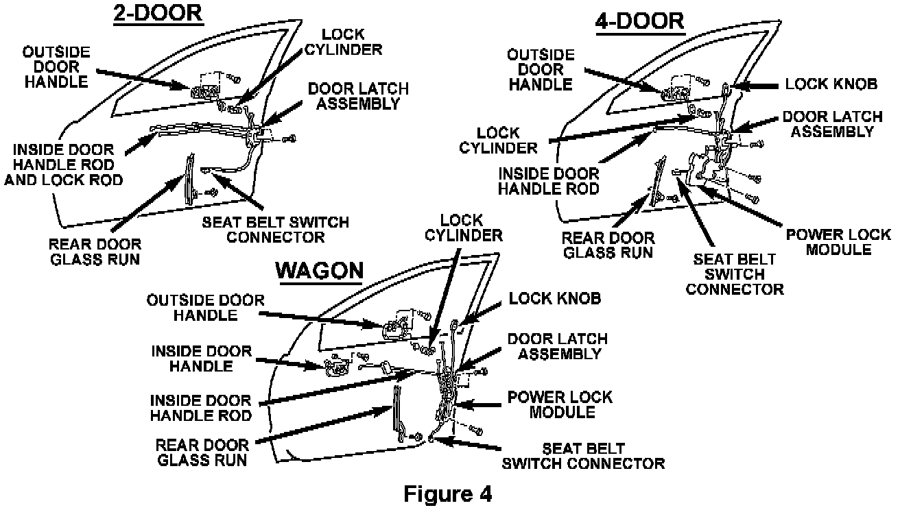 17. Remove the door latch and power lock actuator (if equipped) as an assembly (Figure 4).