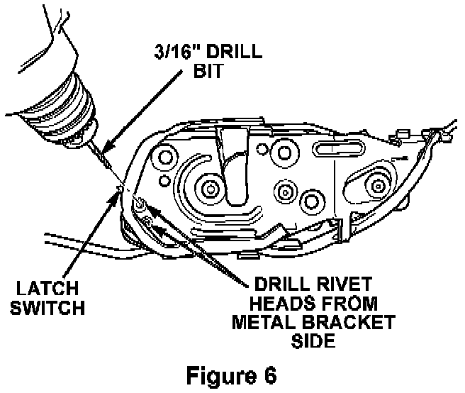A. Drill the head from the rivets on the metal bracket side of the latch assembly using a 3/16(5 mm) drill bit (Figure 6).