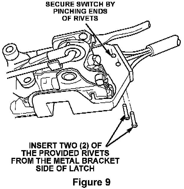 22. Secure the switch by installing two of the provided rivets through the latch and switch from the metal bracket side and then pinching the ends with pliers (Figure 9).