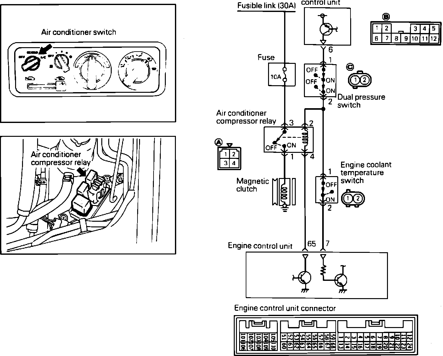 When the driver turns on the A/C system, and the engine temperature is below 238° F, a positive voltage signal is supplied to the ECM (as an indication that the A/C system is needed) and to one side of the A/C relay coil. The ECM determines if engine conditions are suitable for A/C operation (idle speed, ignition timing and air/fuel mixture). If conditions are suitable for A/C operation, the ECM supplies the ground circuit for the A/C relay coil, energizing it. This allows the relay to supply voltage to the compressor clutch.