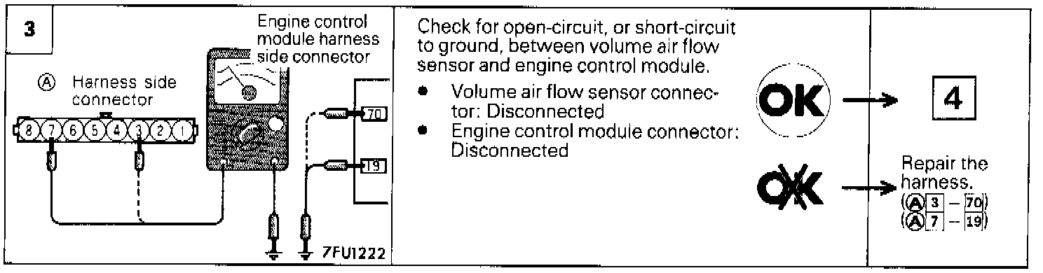 Hint 2: If the volume air flow sensor output frequency is other than 0 when the ignition switch is turned ON (but not starting the engine), faulty volume air flow sensor or engine control module is suspected.