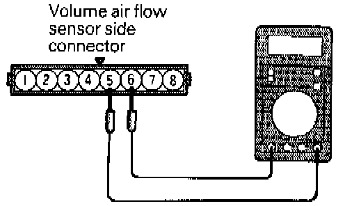 1. Disconnect the volume air flow sensor connectors.2. Measure resistance between terminals 5 and 6.