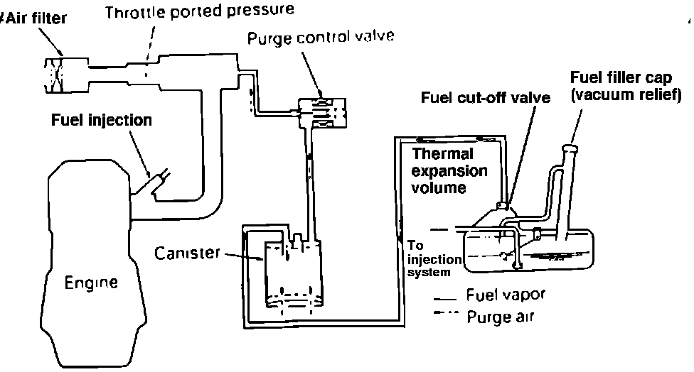 The evaporative control system prevents the escape of fuel vapors from the fuel tank and fuel injection into the atmosphere.