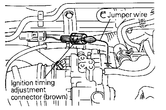 9. Connect the jumper wire to the ignition timing adjustment terminal, and a good ground as illustrated.