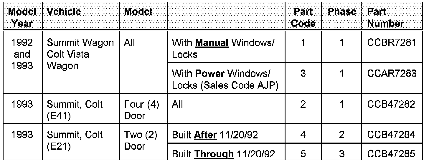 The part package for Colt/Summit vehicles built after 11/20/92 (CCB47284), only contains a guide rail.