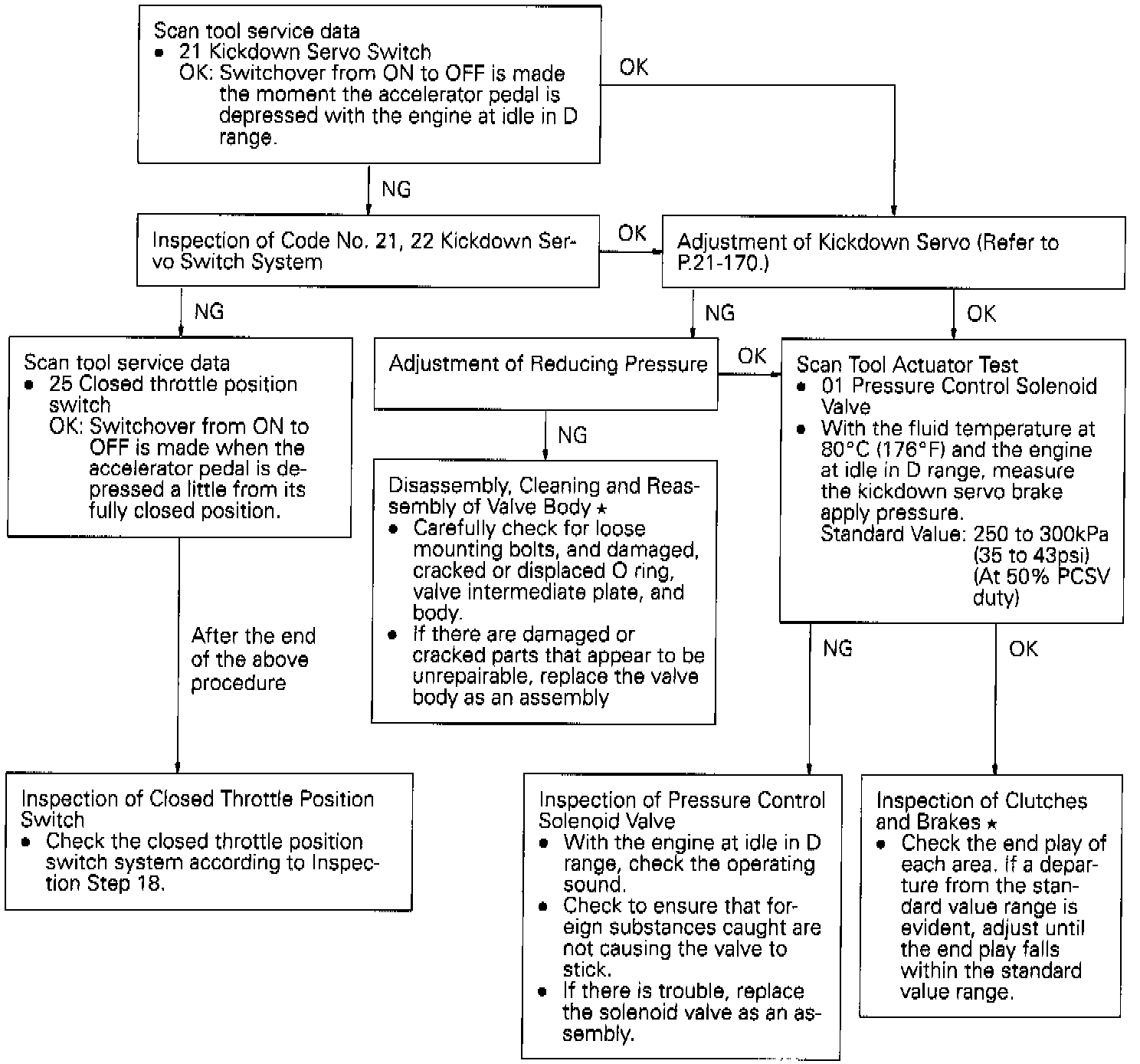 A downshift or upshift during operation causes shock. In addition, the transmission speed exceeds the engine speed. In this case, an abnormal reducing pressure or a defective kickdown servo switch, etc. are suspected.